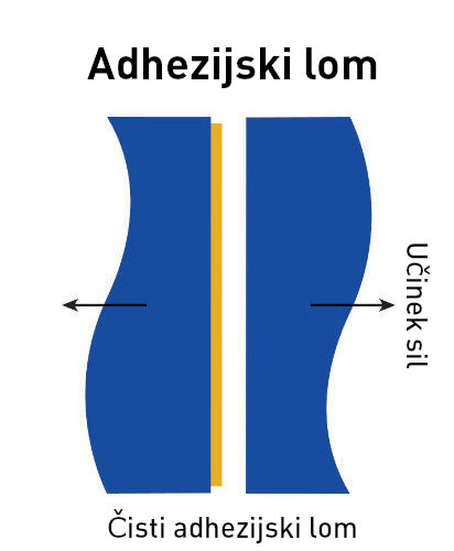 Če je po preskusu ali lomu vse lepilo na enem substratu, na drugem pa lepila sploh ni, govorimo o čistem adhezijskem lomu.